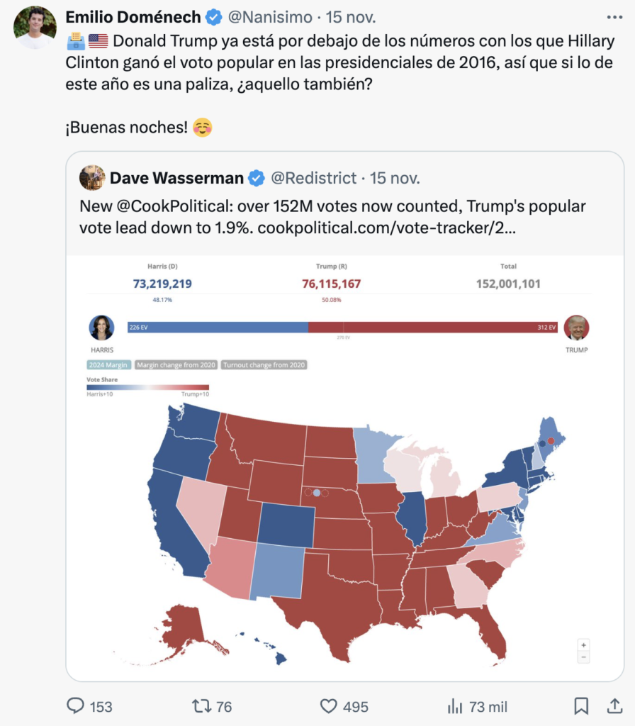 La segunda, que me parece la más plausible, es que esté buscando entre los datos, alguna señal que diga «no ha sido para tanto». A esto le veo dos problemas. El primero, lo inútil que es. Este tipo de análisis supone limitarse a mirar el proceso político que culmina en un determinado resultado electoral como si un partido de fútbol se tratara, centrados únicamente en qué tal lo ha hecho mi equipo, diga lo que diga el resultado. El tuit de Emilio es poco más que un «Al final solo hemos perdido 2-1 y eso, si te fijas, a pesar de que no habían regado el césped antes del partido.» O puesto de otro modo: los Republicanos van a controlar presidencia, Congreso y Senado, pero el voto popular dice que no ha sido una paliza. Pues OK.